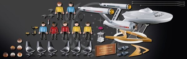 Wohl ab September wird das Raumschiff von Playmobil zu kaufen sein. Ein deutscher Preis steht noch nicht fest, in den USA gibt es Preisvorstellungen von 500 US-Dollar. Damit scheiden wohl Kinder als Käufer aus und Playmobil hat wohl alte Trekkies wie mich im Visier. Das Set trägt die Nummer 70548. Auf den Playmobil-Seiten konnte ich noch keine Infos finden, aber in Instagram wird man fündig. Die Enterprise misst als Spielzeug wohl einen Meter und kann bespielt werden. Auf den ersten Abbildungen ist die Brücke samt Mannschaft unter der Führung von Captain James Tiberus Kirk zu sehen – alles im Design von 1966. Im Maschinenraum führt Scotty das Kommando und auch ein Warp-Kern ist vorhanden. Das Dach der Untertassenbrücke sowie das Seitenteil des Maschinenraums scheint abnehmbar und bespielbar zu sein – ein Traum für mich als Kind (und Sammler). Die siebenköpfige Mannschaft der Original Serie bei Playmobil besteht aus Kirk, Spock, Dr. McCoy (Pille), Scotty, Uhura, Sulu und Chekov sowie Bewaffnung und Tricorder.