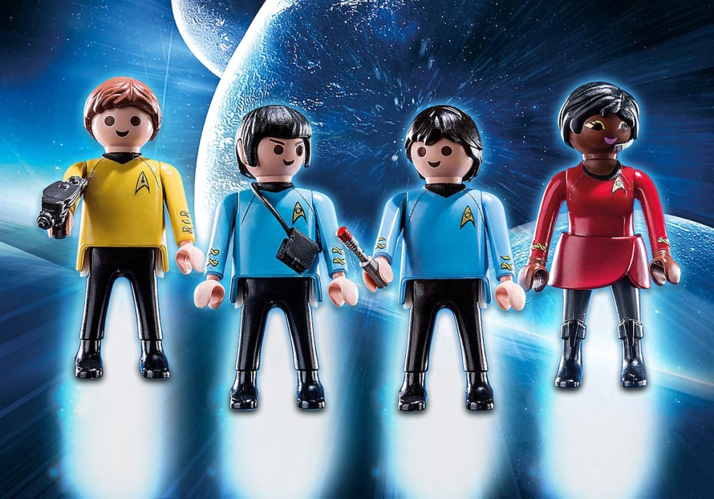 Noch interessanter ist allerdings das Star Trek – Figurenset mit der Playmobil Nummer 71155. Das Set enthält die Crewmitglieder der Enterprise: Captain James T. Kirk, Mr. Spock, Nyota Uhura, Dr. Leonard McCoy samt Zubehör die Trikorder, Phaser – was McCoy in den Händen hält, weiß ich nicht. Es sieht eher aus wie ein Schraubendingsi der Zukunft, würde aber dann doch besser zu Montgomery Scott. Der ist allerdings nicht im Set enthalten. Und so hoffe ich auf eine weitere Ausgabe mit weiteren Figuren. Ich wünsche mir: Chefingenieur Montgomery Scott, Navigator Pavel Chekov, Navigator Hikaru Sulu und cool wäre auch Star Trek-Erfinder Gene Roddenberry. Vielleicht kann sich Playmobil ja zu diesem Set durchringen.