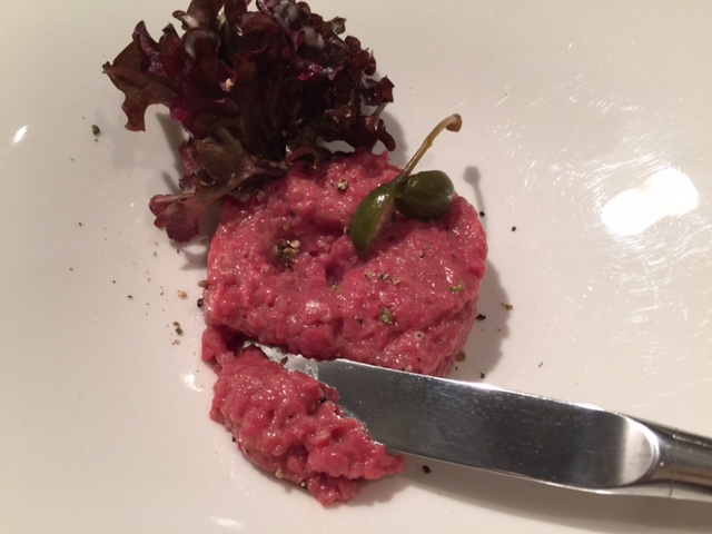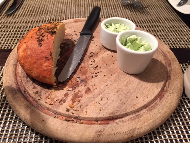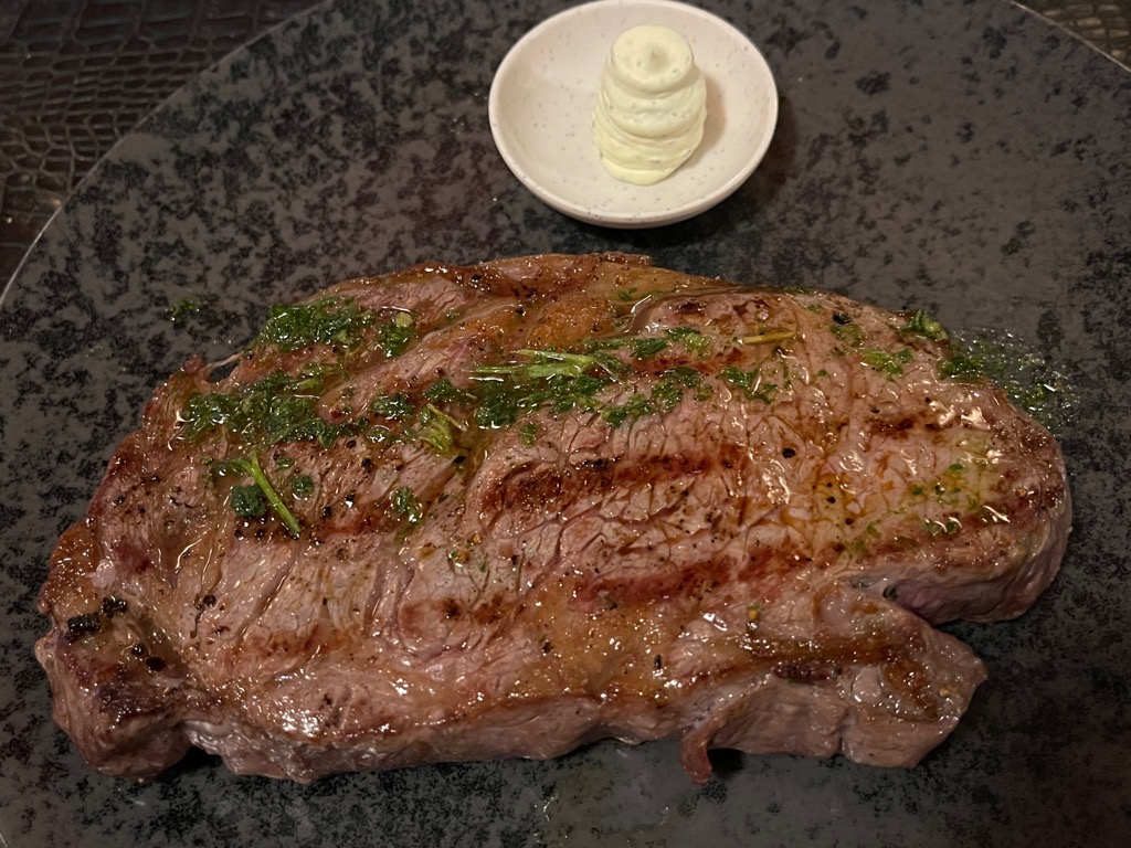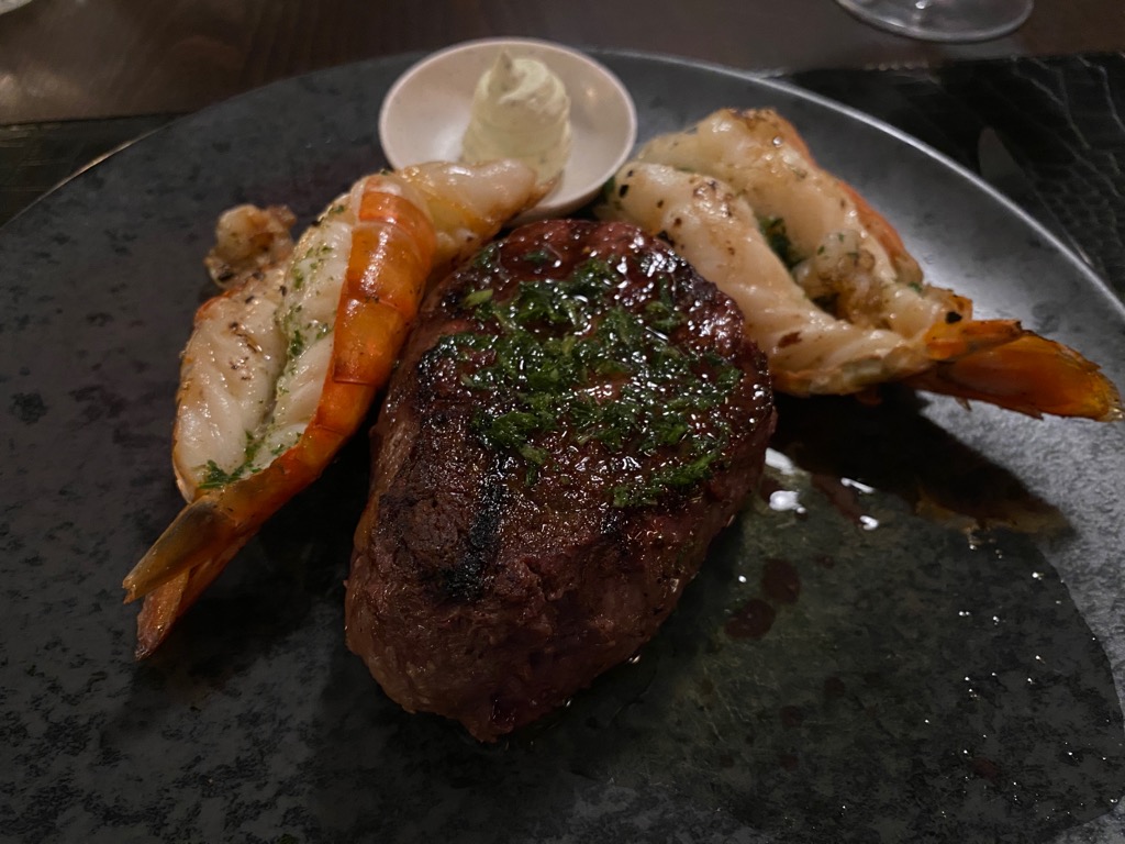 Nachdem die Steaks im Internet gelobt wurden, wählte ich ein ausgezeichnetes Rib Eye rare und die Gattin sprach dem Surf and Turf zu. Weil wir spät kamen, ging das Fünf-Gang-Überraschungsmenü nicht mehr.