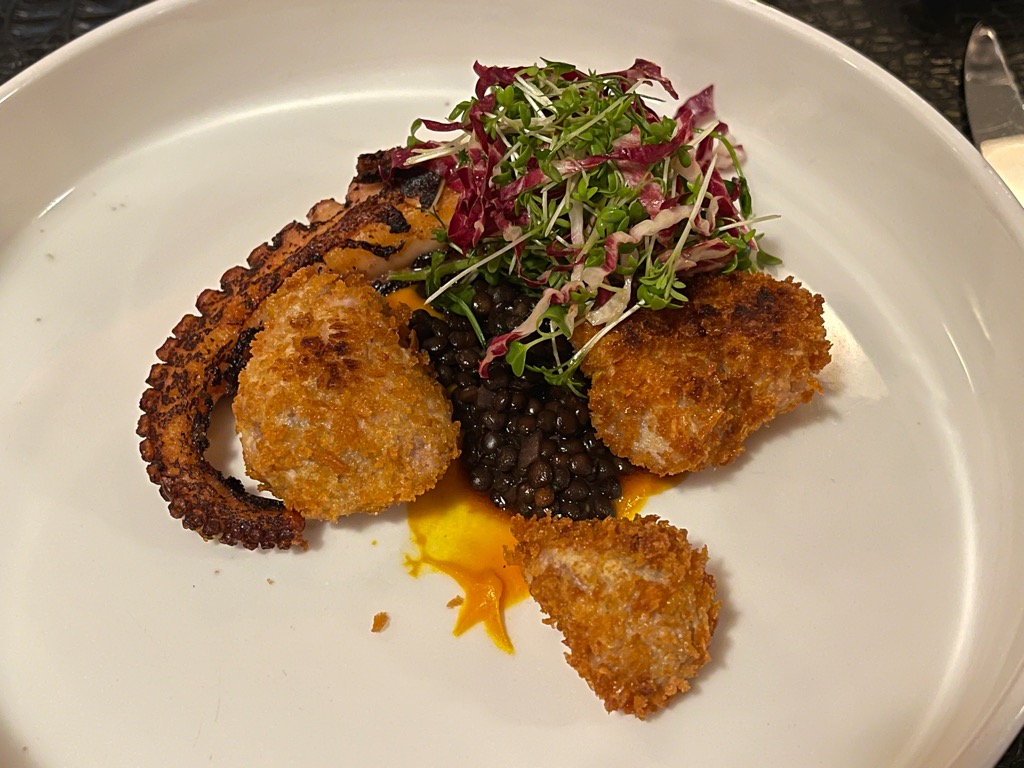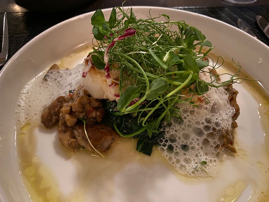 Als Aperitif wählte ich einen Portwein. Gruß aus der Küche gab es keinen, dafür Brot mit Salz/Pfeffer samt Olivenöl. Als Vorspeise wählten wir eine hervorragende Kombination von Kalbsbries und Pulpo mit Belugalinsen und Kürbispüree. Die Gattin wählte Jakobsmuscheln mit Steinpilzen, Knoblauchschaum und Shizo Kresse.