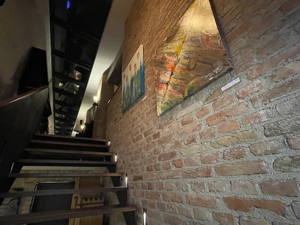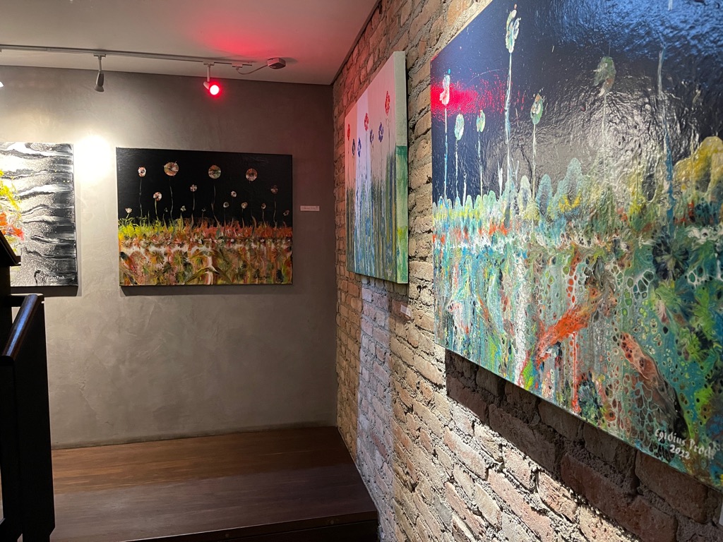 Interessant ist die Kombination Restaurant, Bar und Ausstellungsraum. Bei meinem Besuch wurden großformatige Acrylic Pouring-Bilder des Kirchenmalers Egidius Prock ausgestellt. Egidius Prock wurde 1953 in Dietfurt als Sohn des Malermeisters Egid Prock geboren, der als bayrisch-chinesischer Kaiser Ma-Ler-Gie bekannt wurde. Beim Acrylic Pouring werden die Farben auf den Malgrund gegossen. Prock verwendet hierzu gerne quadratische Leinwände in der Größe von 80 mal 80 Zentimeter.