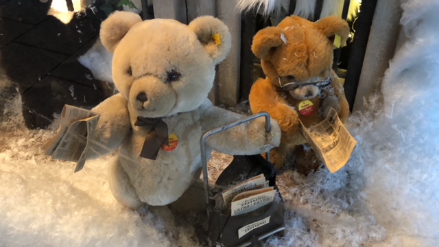 Seit über 30 Jahren gibt es in der Vorweihnachtszeit die „Steiff Weihnachtsschaustücke“ zu bestaunen. Es gibt diese Schaufenster auch beim Kaufhof in Kassel, Frankfurt Zeil, Mannheim, Bonn, Köln, Düsseldorf Königsallee und Hannover Ernst-August-Platz zu erleben, aber ich liebe eben die Münchner Momente. Dort bewegen sich die aktuellen Steiff-Kollektionen in märchenhaften Umgebungen. Wenigstens dort liegt dieses Jahr Schnee. Kleine Szenen werden darstellt und das Ganze erinnert mich an die Wimmelbilder meiner Kindheit. Je mehr ich zuschaue, desto mehr entdecke ich. Daher Zeit nehmen und Augen auf. Dieses Jahr ist für mich der Höhepunkt die beiden Bären rechts vorne, die einen Fisch grillen. Aber es gibt so viel zu entdecken und bitte unbedingt auch in die Bärenhöhlen schauen – dort verstecken sich putzige Gesellen.