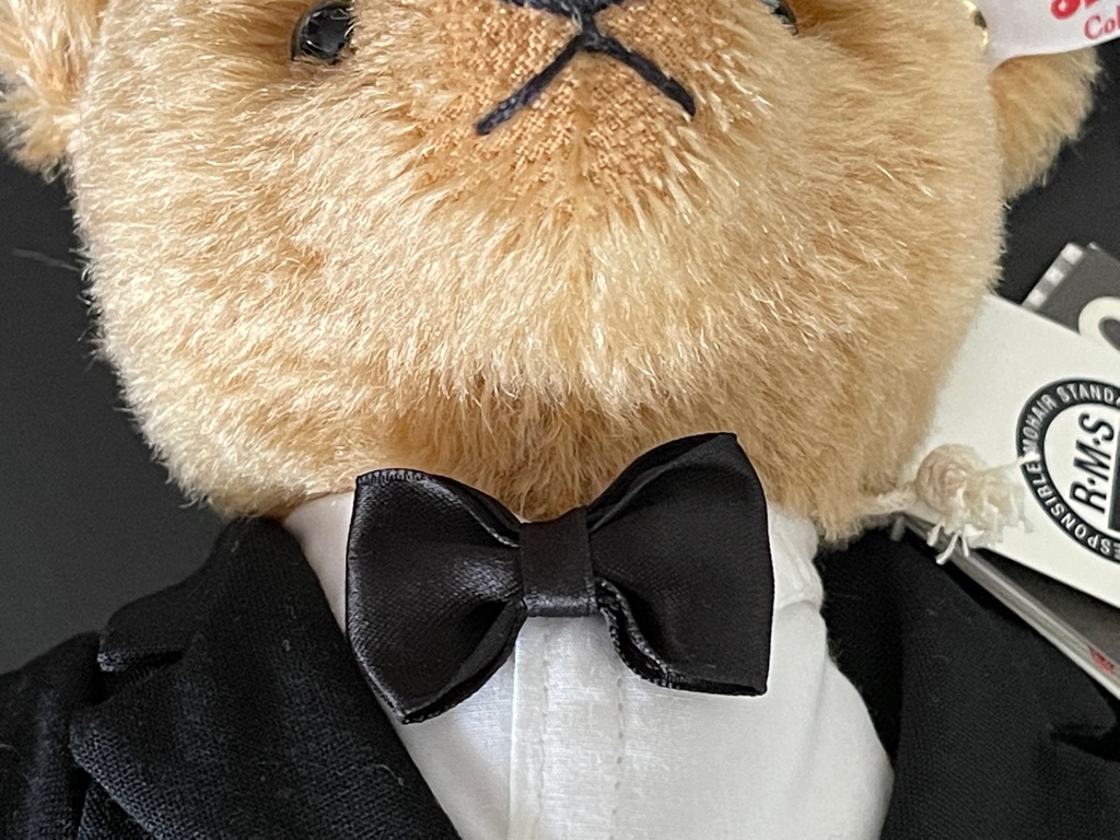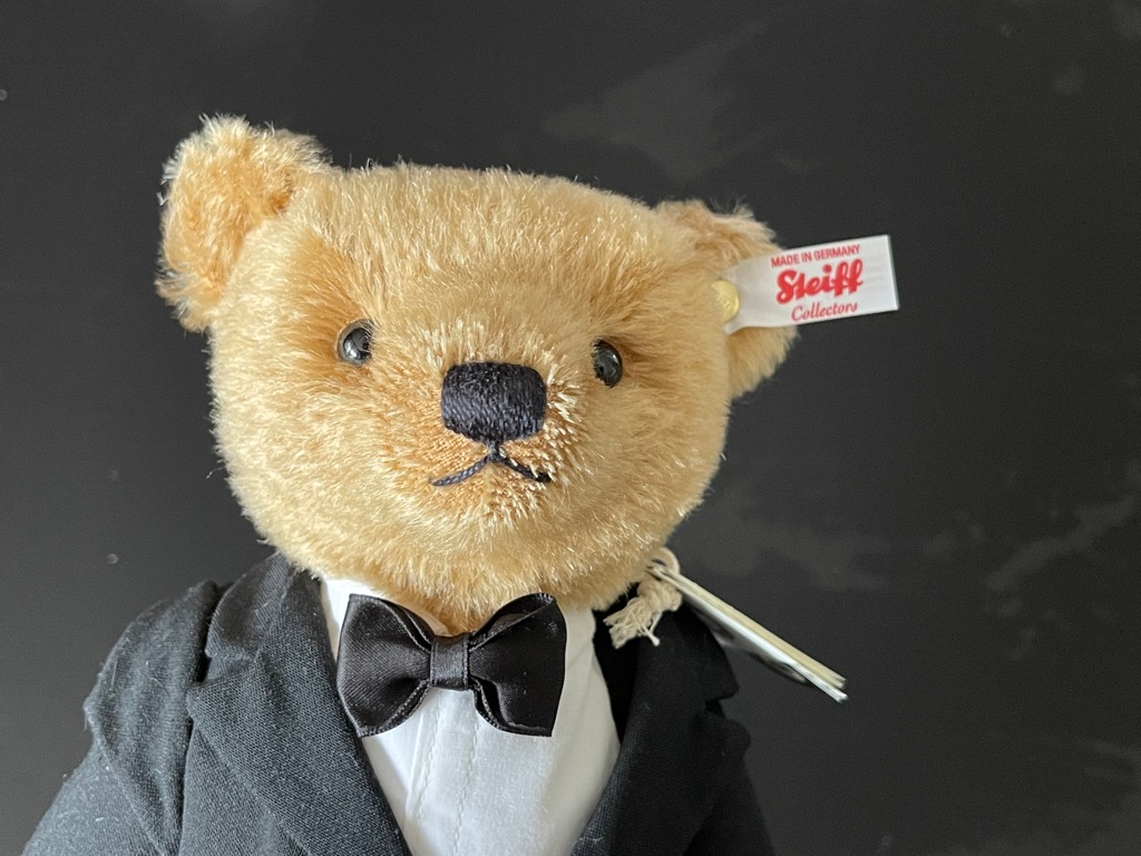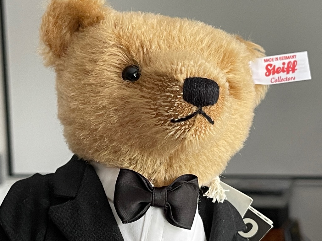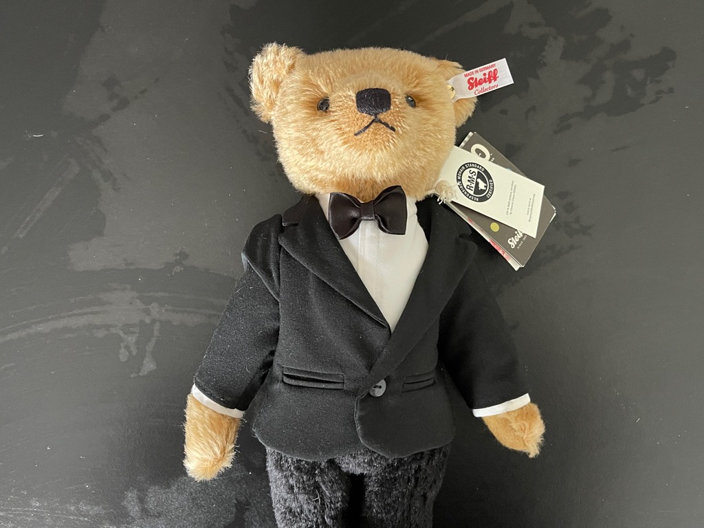 Dieser exklusive Bond-Bär ist vom eleganten Stil von 007-Reihe inspiriert. Er trägt den kultigen Smoking mit Mohairhosen samt schwarzer Flieger und präsentiert stolz das James Bond 60. Jubiläumslogo auf zu seiner Fußsohle. Seine fortlaufend nummerierte Ohrfahne und der „Knopf im Ohr“ zeichnen es als limitiertes Produkt von Steiff aus.