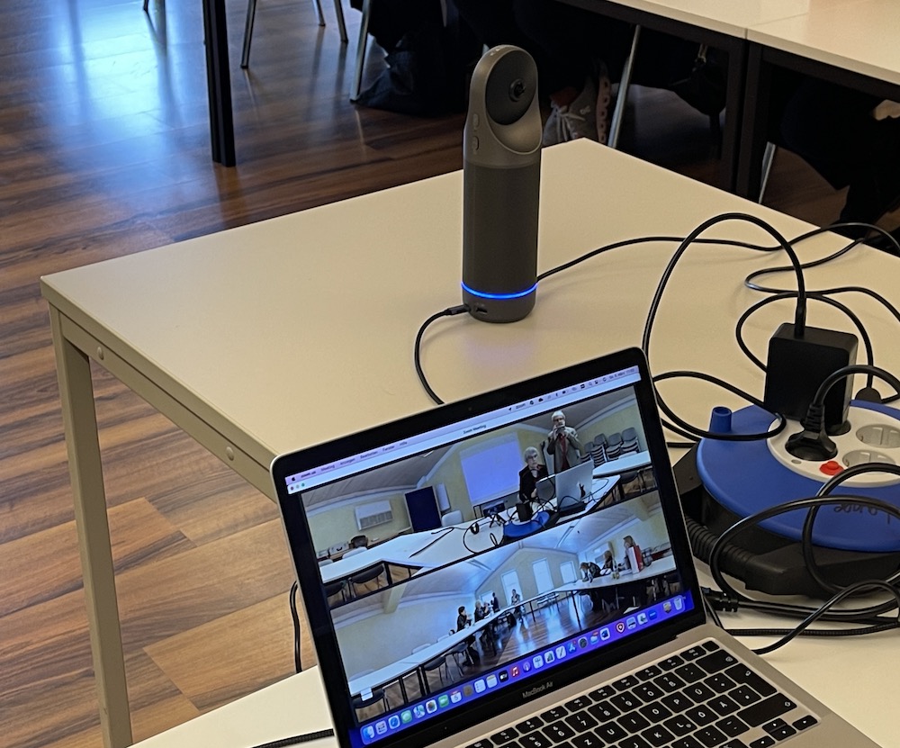 So auch bei einem meiner Kunden, die regelmäßig Vorstandssitzungen durchführen. Nicht alle Vorstandsmitglieder können bei den Sitzungen der Vereinigung teilnehmen, weil beispielsweise die Anreise zu aufwändig wäre oder Mitglieder im Urlaub sind, aber dennoch an den Beschlüssen beteiligt werden wollen. So positioniere ich die KanDao Meeting Pro 360 in der Mitte eines Konferenztisches. Wenn kein Tisch vorhanden ist, ist die Kamera auch auf ein Stativ schraubbar. Die Mitglieder der Sitzung platzieren sich herum. Die Kamera ist mit einem Mac über HDMI angeschlossen, der wiederum an einem Beamer hängt auf dem die externen Teilnehmer zu sehen sind, die über Zoom der Veranstaltung beiwohnen. Zoom hat sich als hervorragende Meeting-Software bei mir bewährt, es funktioniert auch bei Webex und Teams.