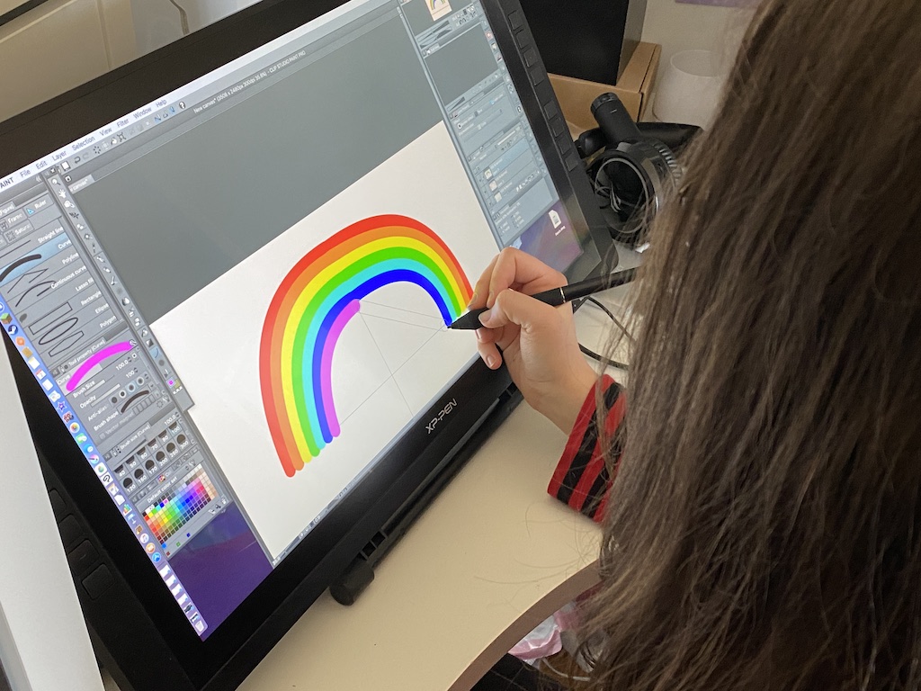 Ich habe von Mamas und Papas aus der Nachbarschaft gehört, dass auch einige Kindergärten Malvorlagen und Anregungen verschicken, damit die Aktion Fahrt aufnimmt. Ich finde es prima. Bei mir zu Hause hat ein Kind den Regenbogen am Grafiktablett gezeichnet – wir sind eher eine digitale Familie.