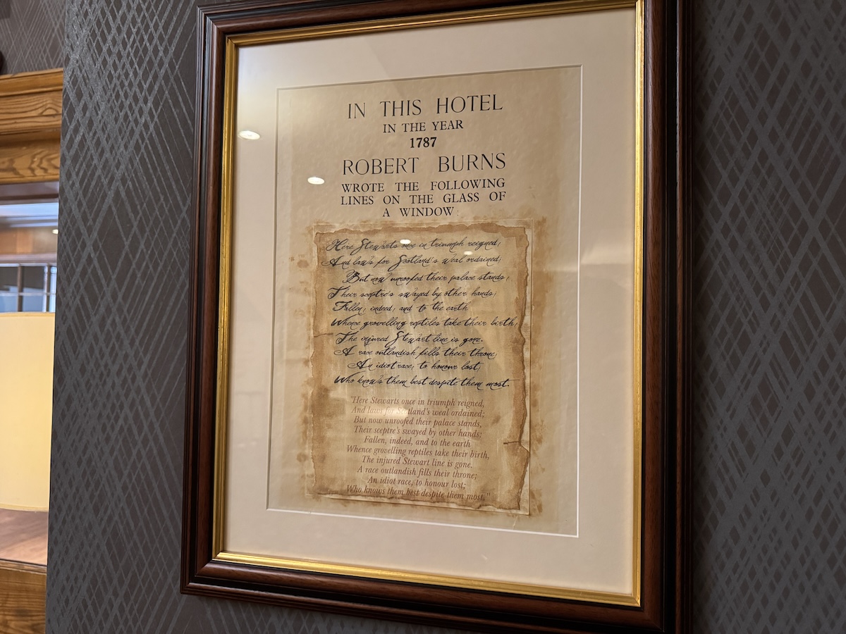 Schottland ist stolz auf seine Helden: William Wallace, Robert the Bruce, Rob Roy, Robert Burns und viele mehr. Hier eine kleine Geschichte von Burns aus meinem Hotel Golden Lion in Stirling, in dem ich geschlafen habe.
