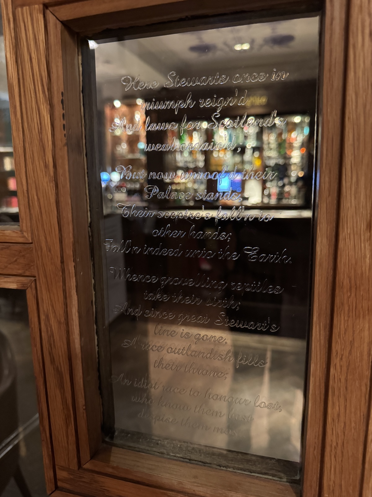 Während seines Aufenthalts im Hotel verfasste Burns ein paar Zeilen, die er – der Überlieferung nach – in eine Fensterscheibe ritzte. Darin beklagt er den Verfall der einstigen schottischen Monarchie und spielt auf das heruntergekommene Stirling Castle an, das er vom Fenster seines Zimmers aus sehen konnte.
