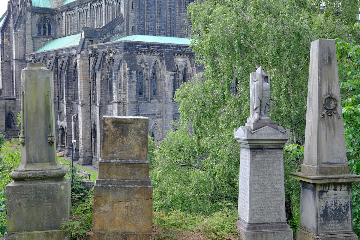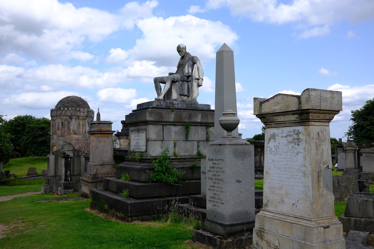 Mehr als 50.000 Menschen sind im Glasgow Necropolis begraben, doch nur etwa 3.500 Gräber sind durch aufwändige Monumente und kunstvolle Inschriften gekennzeichnet. Viele der Namen, die man hier liest, sind untrennbar mit der Geschichte Glasgows verbunden. Da ist zum Beispiel John Knox, der berühmte schottische Reformator, dessen imposantes Denkmal hoch oben auf dem Hügel thront – auch wenn er selbst nicht hier begraben liegt, sondern symbolisch für die protestantische Tradition Schottlands steht. In unmittelbarer Nähe finden sich die Gräber von William Miller, dem Dichter des berühmten Kinderliedes „Wee Willie Winkie“, und Charles Tennant, einem Chemiker und Industriellen, der mit seiner Erfindung der Bleichpulverproduktion Glasgows wirtschaftlichen Aufstieg maßgeblich mitprägte.