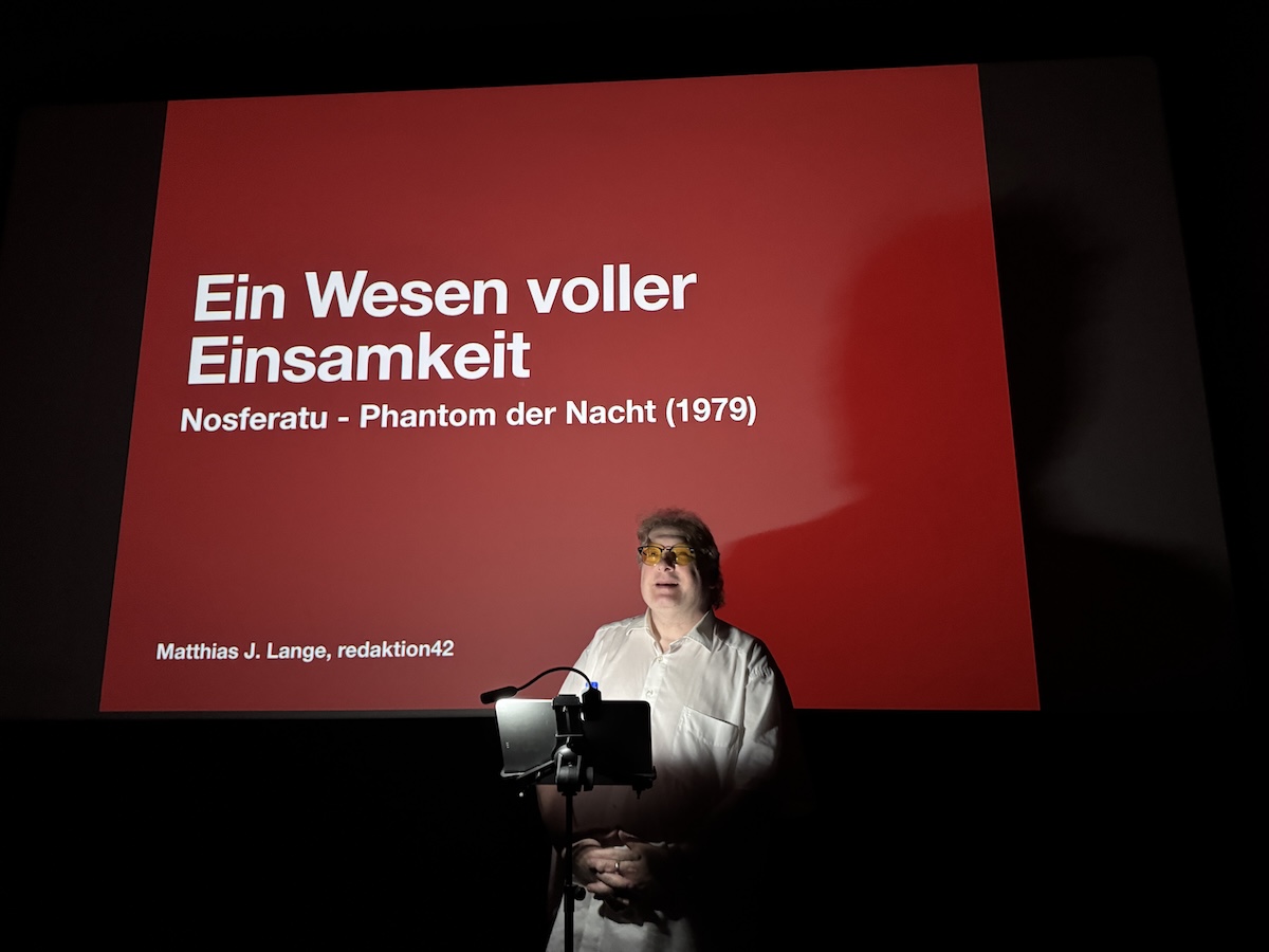Aber zurück zu Werner Herzogs Film. Die 1979 entstandene Hommage an F. W. Murnaus Stummfilmklassiker Nosferatu (1922) stellt eine atmosphärisch dichte Neuinterpretation dar, in der der Vampirmythos als kulturelles, psychologisches und existenzielles Motiv neu verhandelt wird. Hier die Aufzeichnung meines Vortrags.