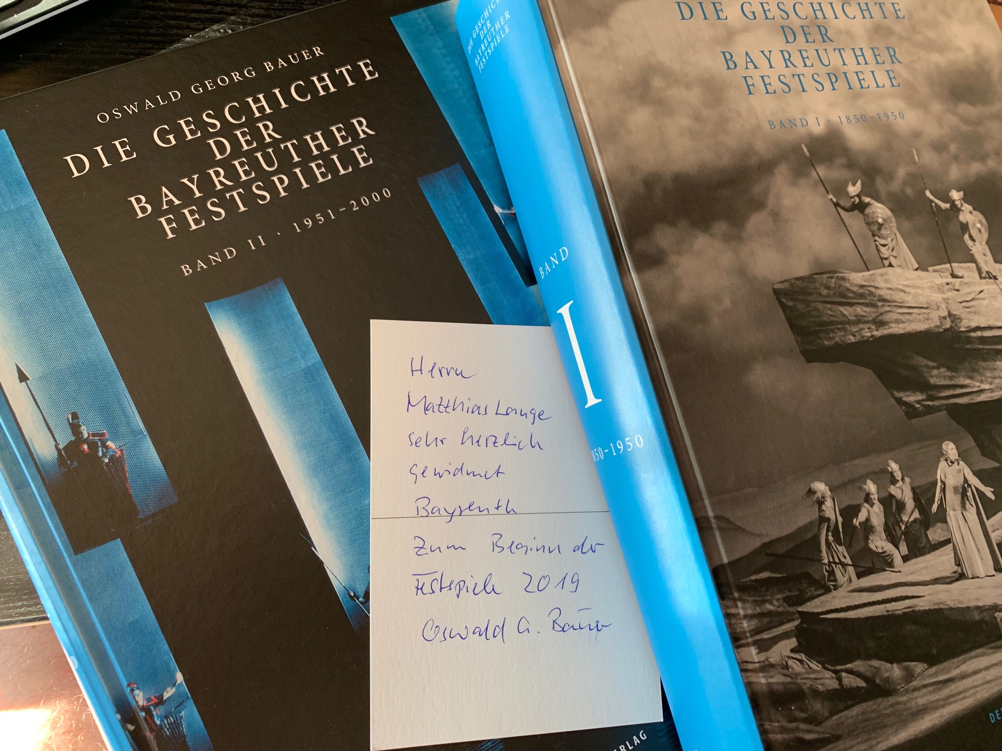 Gerne hätte ich mich mit Oswald Georg Bauer unterhalten. Ich hatte ihn nie bei seiner Arbeit angetroffen, aber ich habe sein Buch Die Geschichte der Bayreuther Festspiele: Band I: 1850–1950 und Band II: 1951–2000 verschlungen. Die beiden kiloschweren Wälzer bieten zum ersten Mal die vollständige Geschichte der Bayreuther Festspiele. Wer sich für Wagner, die Festspiele und die Inszenierungen interessiert, kommt nicht umher, in diese beiden Bücher zu investieren. Die Bücher quellen über vor Detailwissen – das war mir bei der einen oder anderen Inszenierung sogar ein wenig zuviel. Was aber kein Vorwurf an Bauer ist. Die Fotos sind einmalig und in einer solchen Fülle, dass es eine Freude ist, die Bücher als Coffeetable-Book zu nehmen und immer wieder zu blättern. Hier wird Oswald Georg Bauer sicher vom Stuhl fallen, wenn ich bei einem schönen Glas Rotwein die Musik von Wagner und sein Buch genieße. Wer sich wissenschaftlich dem Phänomen Bayreuth näher will, der wird hier fündig.
