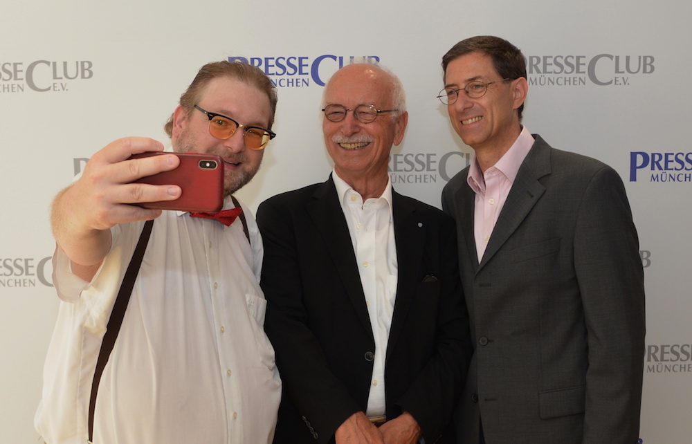 Franz Neumeier (r.) und ich vom Bloggerclub im Gespräch mit dem PresseClub-Vorsitzender Peter Schmalz.