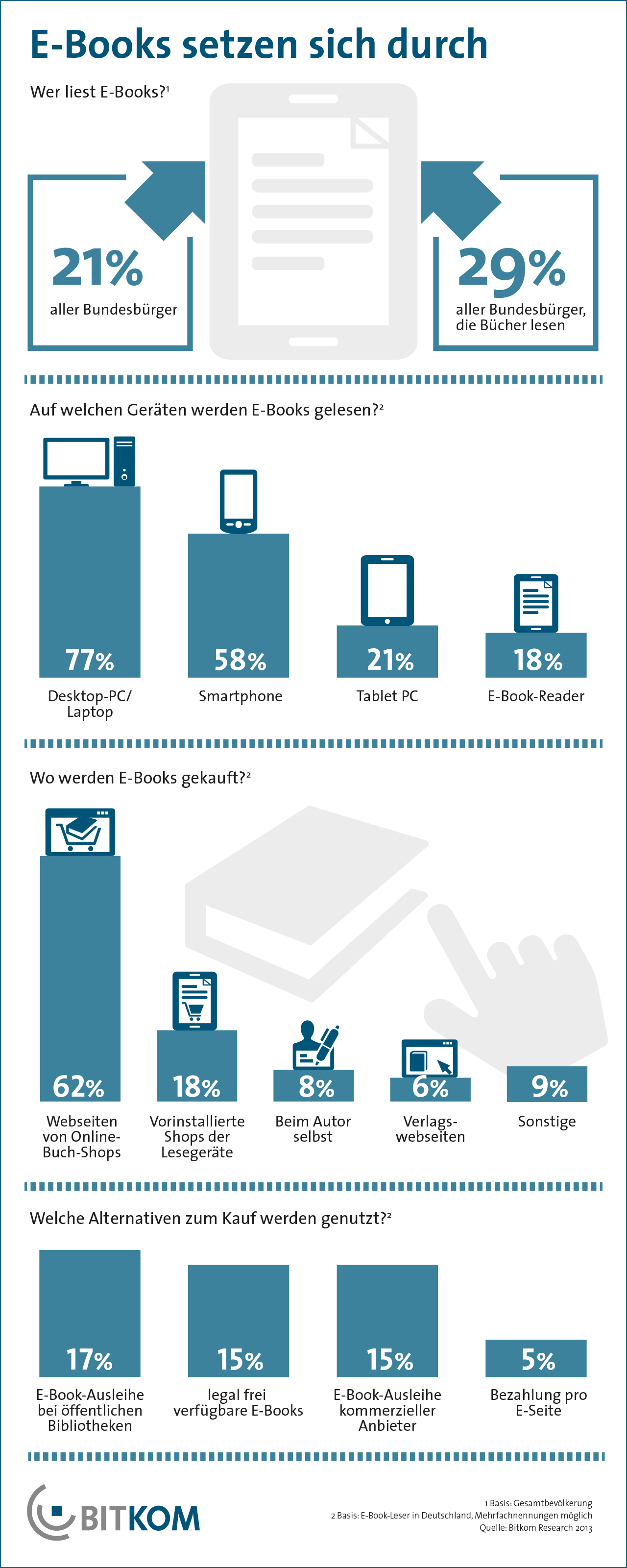 Das am häufigsten gebrauchte Lesegerät ist laut der Bitkom-Umfrage immer noch der Computer: 77 Prozent der befragten E-Book-Leser nutzen Desktop-PC, Notebook oder Netbook, um digitale Bücher zu lesen. So nutzen drei Viertel der „Computer-Leser“ ihre E-Books auf mindestens einem weiteren Gerät. Überraschend stark schneiden Smartphones ab: 58 Prozent lesen E-Books auf Smartphones. Erst danach folgen Tablet Computer mit 21 Prozent und spezielle eReader mit 18 Prozent.