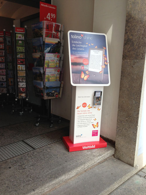 Es tut sich viel in Sachen eBooks. Nachdem Weltbild seine Filialen jetzt endgültig schließt und damit die Vertriebsmöglichkeiten von Tolinos eingeschränkt ist, drängt Amazon in die Lücke. Mit einer massiven Werbeaktion an Bahnhöfen und in ICEs versucht der Online-Versender seinen Kindle zu pushen. Die Werbung ist im zurückhaltenden Schwarzweiß gehalten und zeigt Menschen beim Lesen, freilich mit Kindle. Dazu gibt es gute Sprüche wie „Wenn ein Buch ein guter Reisegefährte ist, dann begib dich auf die schönste Gruppenreise der Welt.“ Hier spricht Amazon übrigens das Social Reading ein, denn Kindle ist ja ein Online-Device. Social Reading bedeutet: Ich markiere eine Textstelle in einem Fachbuch und gebe diese Markierung für andere frei. Das macht die Crowd ebenso. So kann ich Fachbücher deutlich schneller lesen.