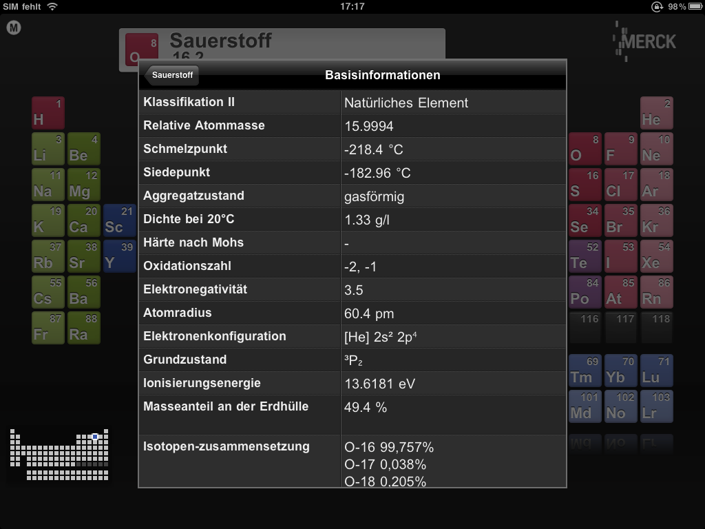Die App ist der Hammer, bietet sie umfangreiche Suchfunktionen und Kategorisierungen. Wer sich nur ein wenig für Chemie oder Bio interessiert, wird diese kostenlose App von Merck laden. Da stört es überhaupt nicht, dass ab und zu auf das Unternehmen Merck hingewiesen wird. So eine Werbung stört nicht.
