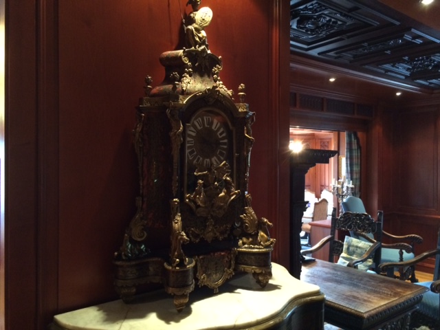 Meiner Frau ist die wunderschöne Boulle Uhr ins Auge gefallen. André Charles Boulle war ein französischer Kunstschreiner im 17. Jahrhundert. Seine Marketerie-Funiere waren unter Ludwig XIV in Frankreich sehr populär. Im 19. Jahrhundert feierte der Boulle-Stil eine Renaissance – aus dieser Zeit kommt auch diese wundervolle Uhr. Schildplatt ist durch bemaltes Ebenholz ersetzt. Die Statue zeigt vielleicht Athene, Göttin der Weisheit, der Strategie, der Kunst, des Handwerks und der Handarbeit. Die Uhr ist noch funktionsfähig.