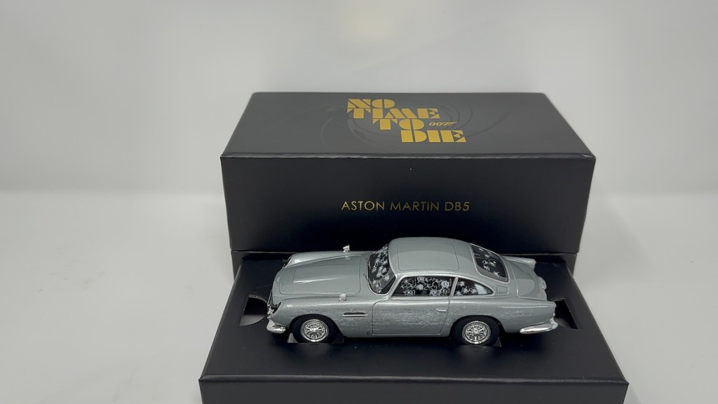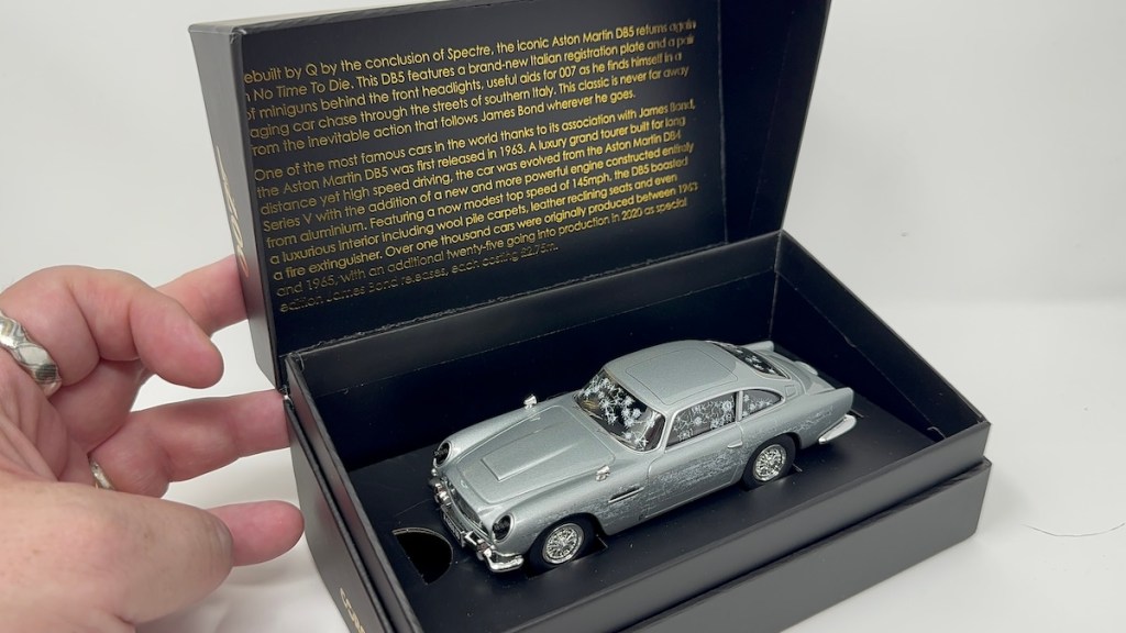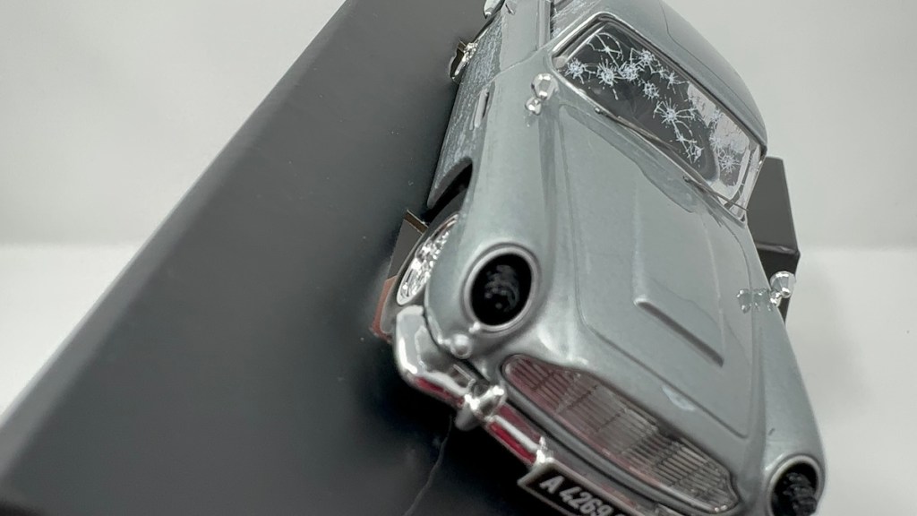 Der Aston Martin DBS ist in einem dezenten Grauton gehalten, der dem Auftritt im Film nachempfunden ist und die eleganten Linien des Sportwagens betont. Fein ausgearbeitete Oberflächendetails, bedruckte Markierungen und realistisch gestaltete Räder mit gummierten Reifen unterstreichen den Anspruch als Sammlermodell.