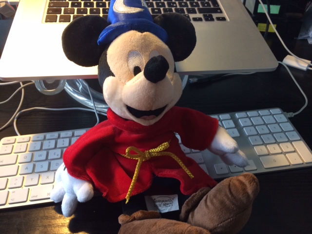 Auch bei mir gehört die Maus zum Leben. Drei Kreise, richtig angeordnet und fertig ist der Mäusekopf – einfach genial. Im Arbeitszimmer stehen verschiedene Figuren, die ich aus Disneyworld Paris mitgebracht habe. Ich habe aktuell im Grunde zwei Lieblingsfiguren der Maus. War ich früher von Micky als Detektiv begeistert, ist es heute retromäßig Steamboat Willie und der Zauberlehrling aus Fantasia.