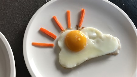 Ei vorsichtig am Pfannenrand aufgeschlagen und der Eidotter in die Sonnenform gefüllt und das Eiweiß verteilt sich in der Wolke darunter. Dann wie üblich – ein Sunny-Side-Up-Ei gemacht. Nach ein paar Minuten ist das Spiegelei fertig und wird mit Form aus der Pfanne gehoben und auf den Frühstücksteller serviert. Silikonform angehoben und zum Schluss kamen noch die Sonnenstrahlen in Form von Karotten hinzu. Fertig war unsere Frühstückssonne am Sonntag.