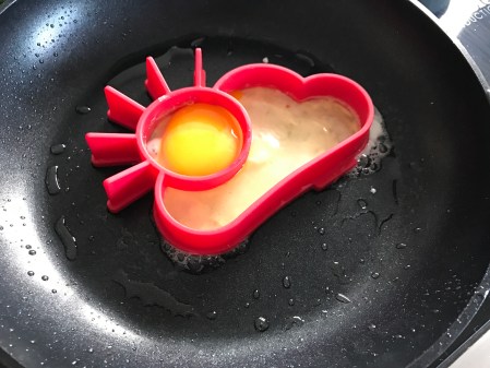Nach kaltem Winter kam heute die Sonne ein wenig heraus und das wollte die Familie auch am Frühstückstisch widerspiegeln. Wir wollten auch die Sonne auf dem Teller haben. Hier bot sich ein Weihnachtsgeschenk von K2 an. Eine Silikonform als Sonne für ein Spiegelei. Also Pfanne mit neutralen Öl erhitzt, die Silikonform in Form einer Sonne in die heiße Pfanne gelegt. Wir haben XL-Bioland-Eier für unsere Sonne verwendet, die wir am örtlichen Bioland-Hof gekauft haben.