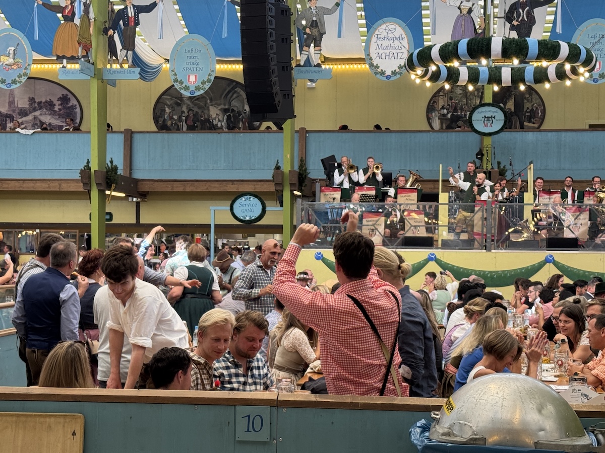 Die Sache mit der Musik In den großen Festzelten auf der Wiesn hat sich Partymusik mit bekannten Wiesnhits, Schlagern und internationalen Klassikern längst zur Norm entwickelt. Die Stimmung ist ausgelassen, die Gäste stehen auf und grölen die berühmten Hits mit – ein Spektakel, das für viele Besucher mittlerweile zum Oktoberfest dazugehört und die Umsätze der Festwirte spürbar steigert. Denn je stimmungsreicher, lauter und mitreißender die Musik, desto öfter wird nachbestellt, desto länger feiern die Gäste im Zelt, und desto mehr fließt das Bier in den Umsatzbericht. Die Wirte wissen: Mit nonstop Partymusik steigt nicht nur die Laune, sondern auch das Geschäft, das Oktoberfest ist für sie ein Milliardengeschäft. Für die Bands ist es harte Arbeit. Bei meinem Besuch im Hofbräuzelt konnte ich vom Balkon beobachten, wie die Stimmung mit zunehmenden Alkoholkonsum hochkochte.
