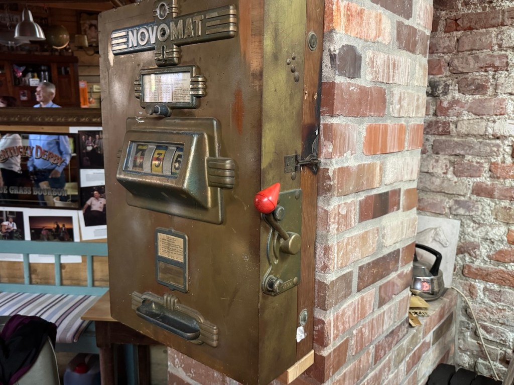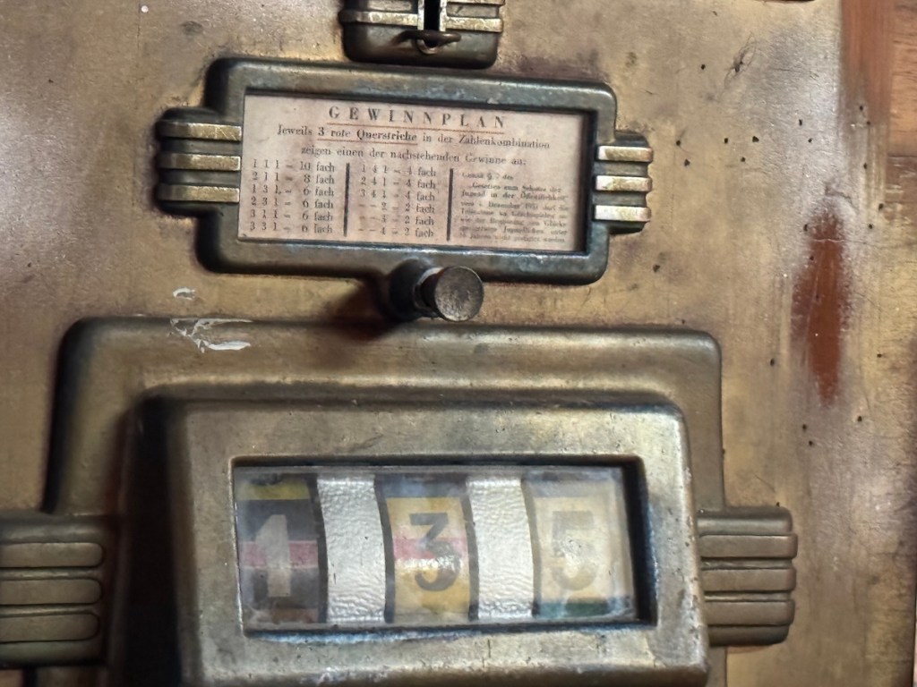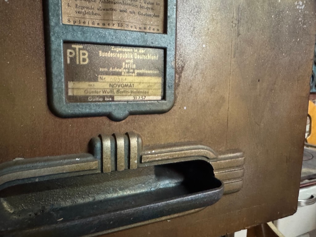 Ein originaler Novomat-Spielautomat aus den 1950er-Jahren. Das Gehäuse aus Holz mit Sichtfenster für die Walzen und verchromten Bauteilen verleiht dem Gerät den zeittypischen Charme dieser Ära.