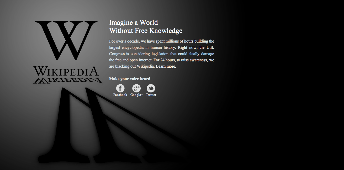 Die englischsprachige Plattform von Wikipedia ist am heutigen Mittwoch nicht erreichbar. Damit protestieren die Macher der Enzyklopädie gegen Pläne der US-Regierung, zum Schutz von Urheberrechten künftig Sperren im Netz einzubauen. Andere Plattformen unterstützen diesen Protest und haben sich angeschlossen. So protestiert auch die Blog-Software WordPress auf der auch dieser Blog läuft. Die Suchmaschine Google in den USA protestiert mit einem Link unter der Suchmaske, der zu einer Online-Petition gegen das Gesetz führt.